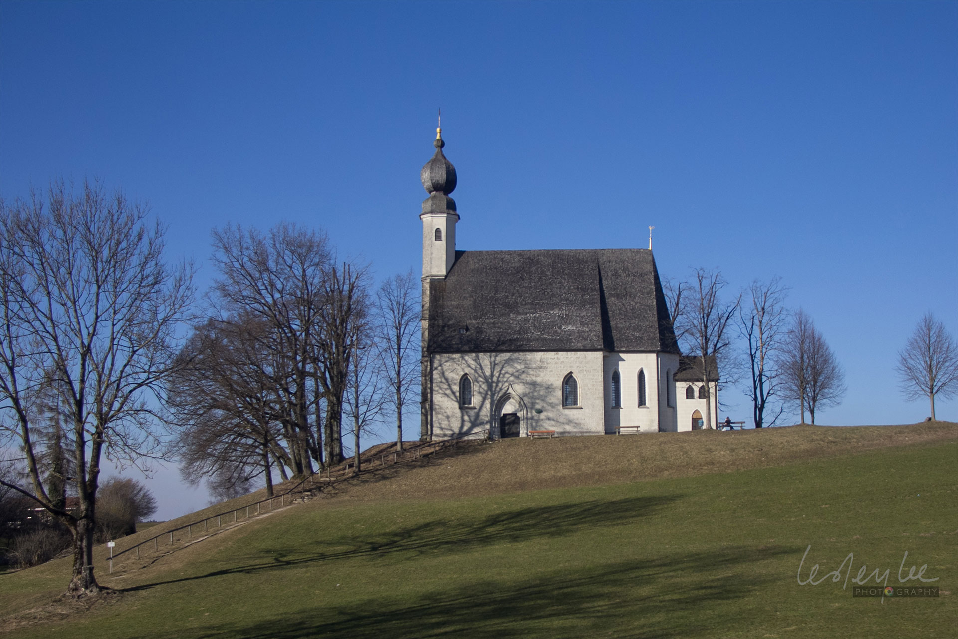 A lonely country church, high up with the blue sky, in the Rosenheim district of Upper Bavaria, Germany