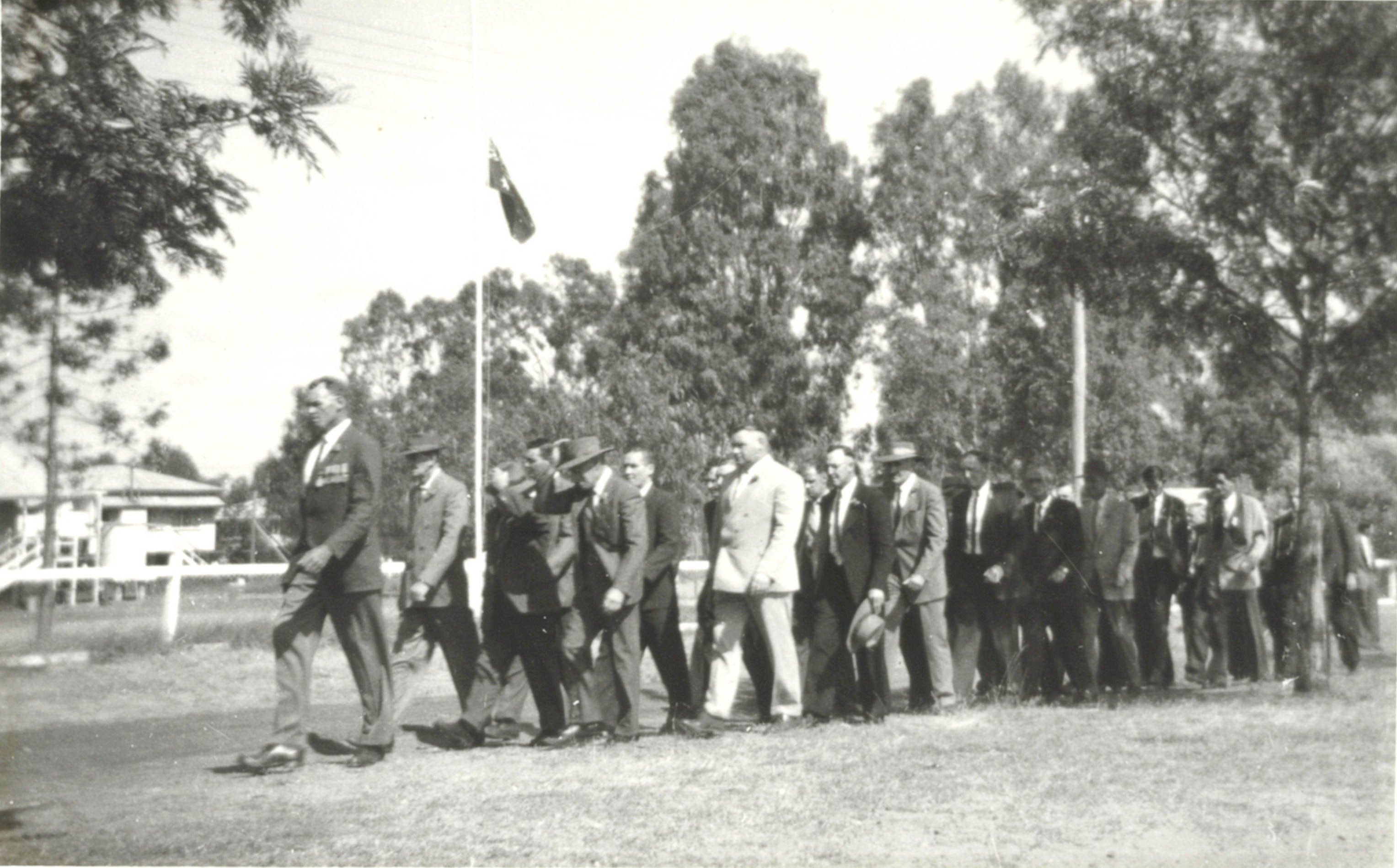1963-Anzac-Day Dad in there somewhere. Hats off as they pass the flagpole.