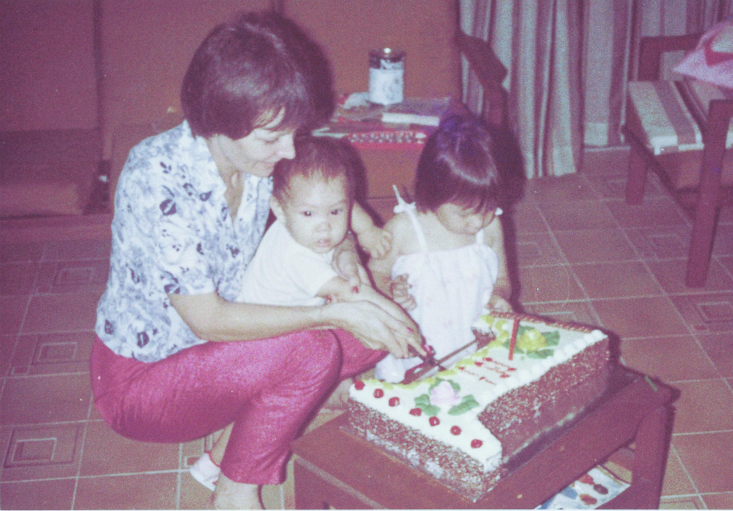 Cutting my birthday cake with help from mum and Nee
