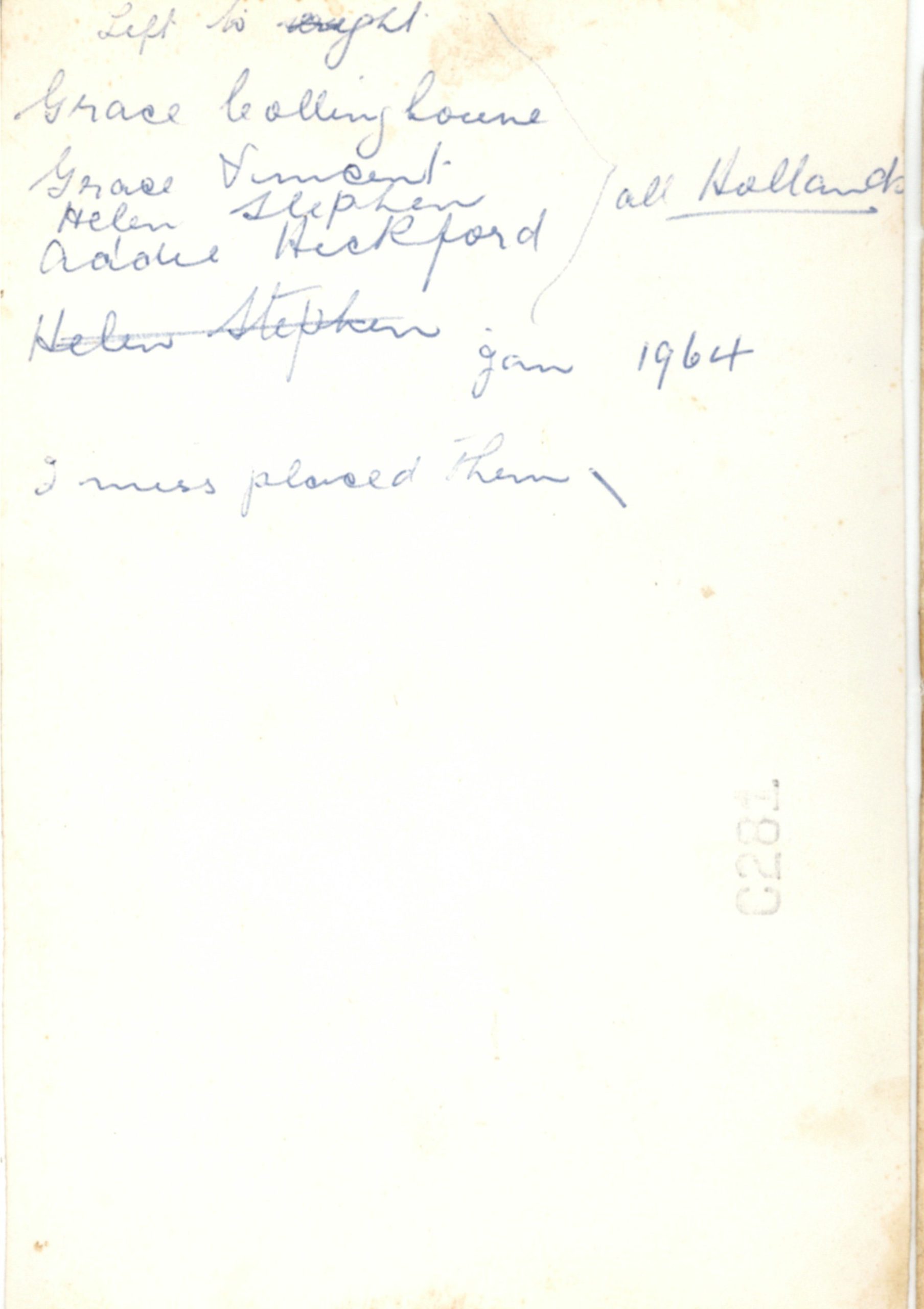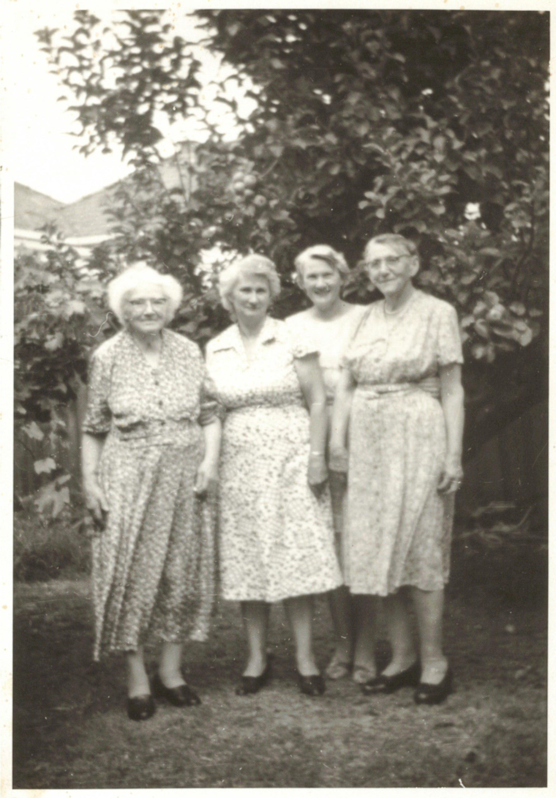 notation on back. Two aunties, two of dad's sisters Jan 1964 L-R Aunt Grace Holland Collingbourne Grace Holland Vincent Aunt Adelaide (Addie) Holland Hickford Helen Holland Stephen