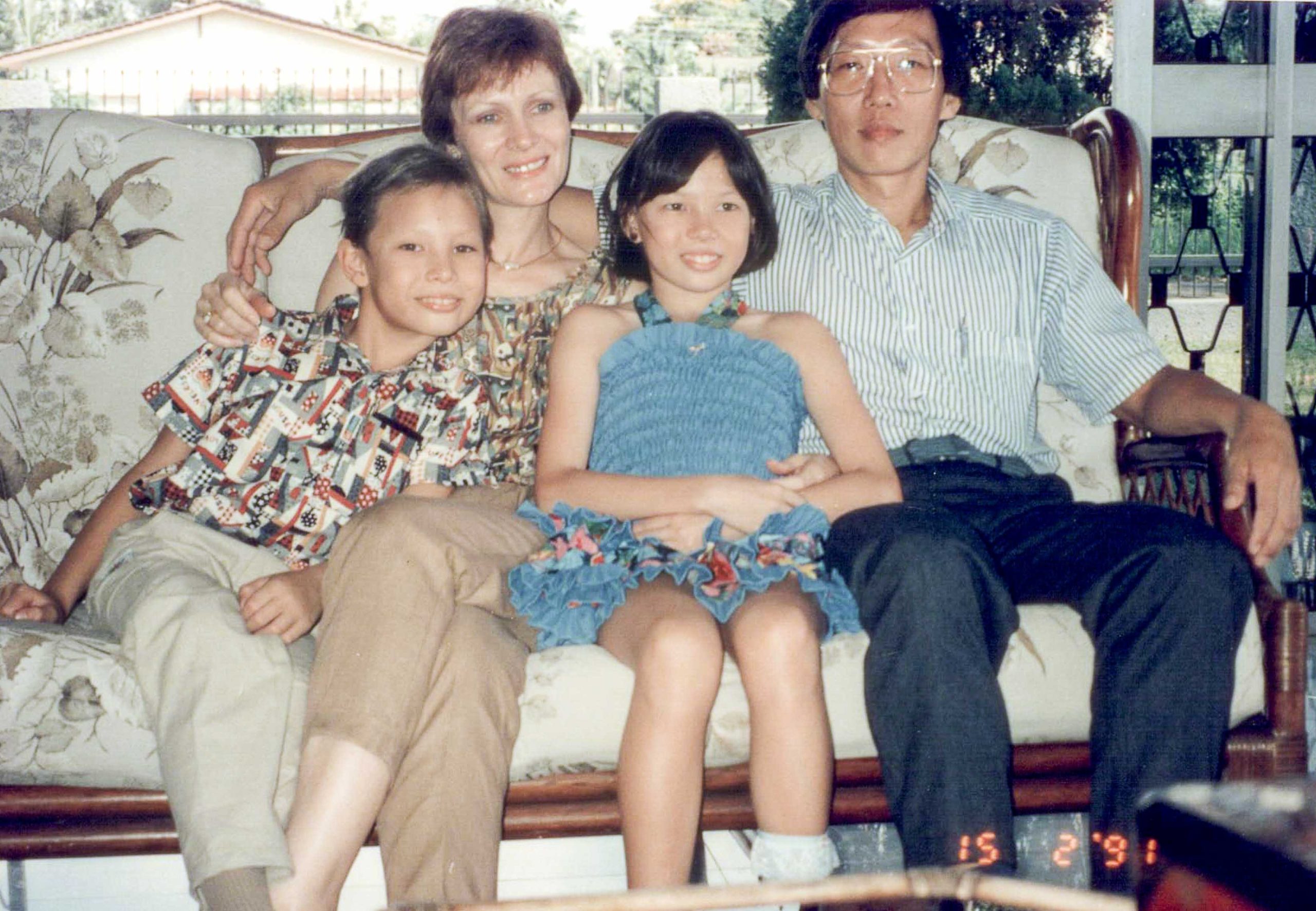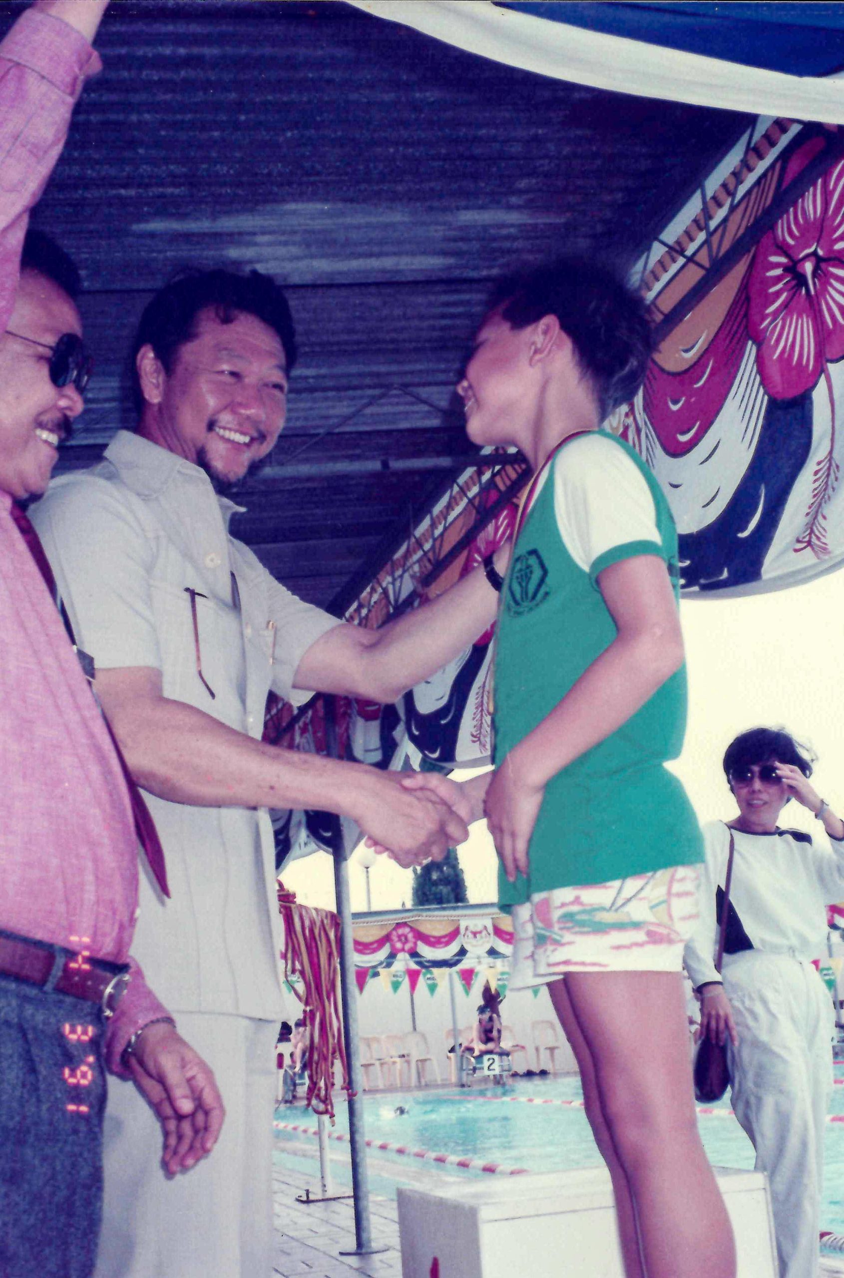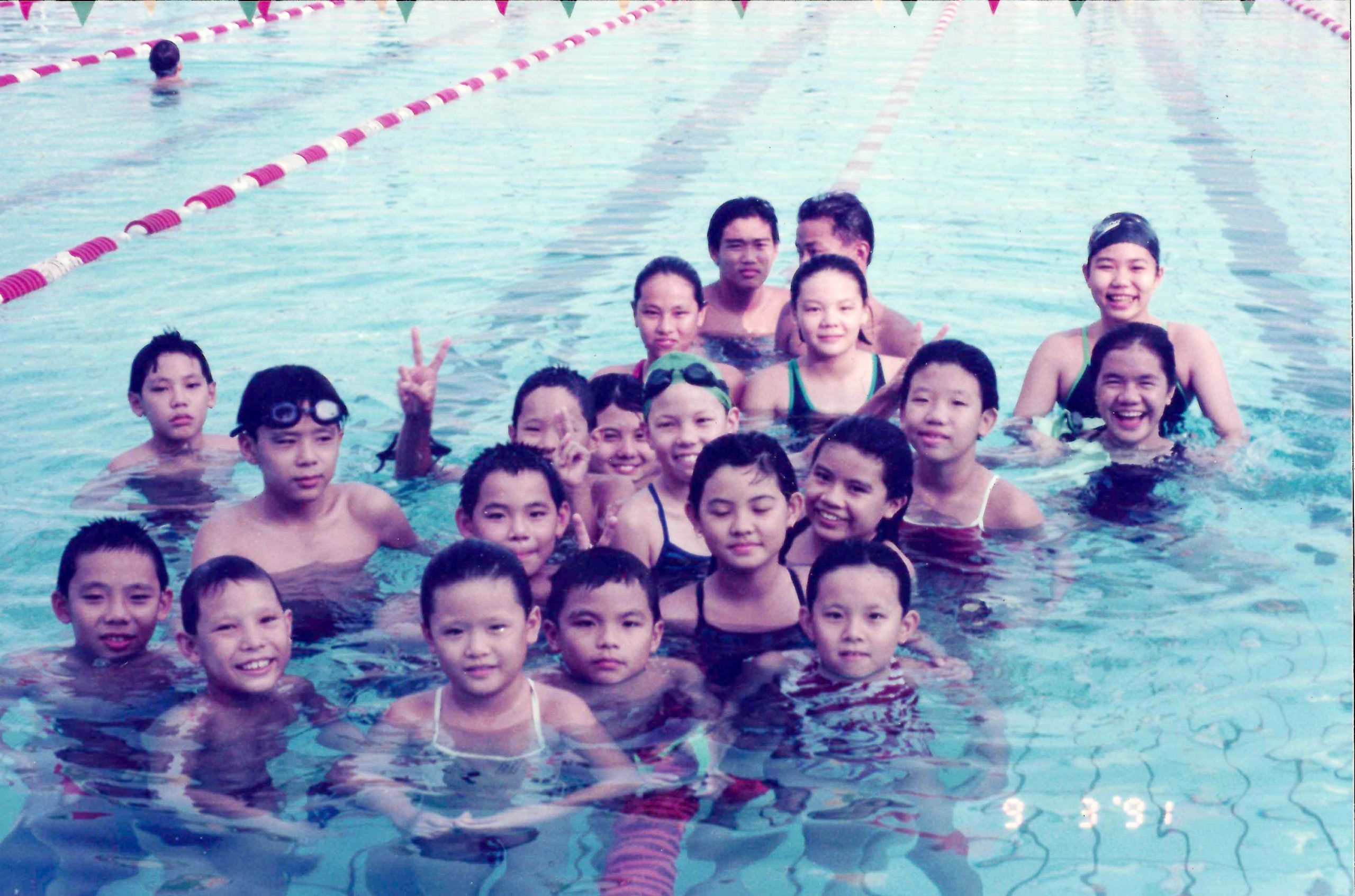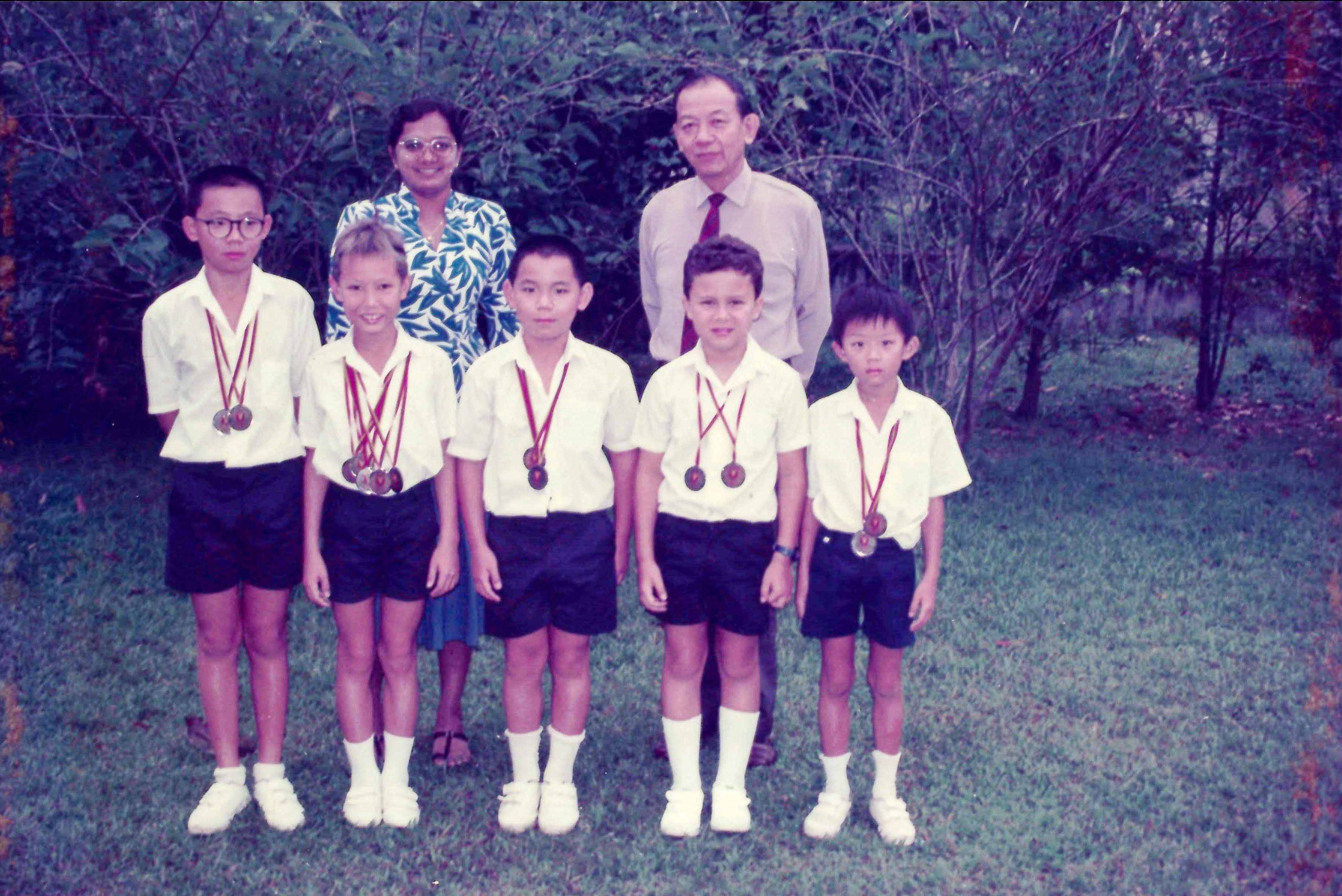Showing off our medals after the MSSS Swimming Championships. 1991 With Miss Joseph & Mr Lee.
